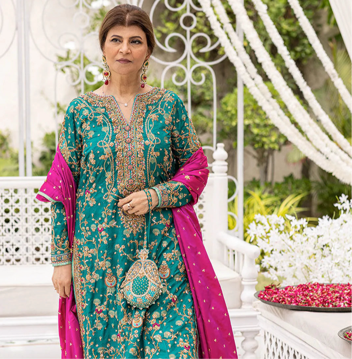 FRONT ON RAW SILK FABRIC WITH WORK OF HEAVY EMBROIDERY AND HAND EMBELLISHMENT WORK